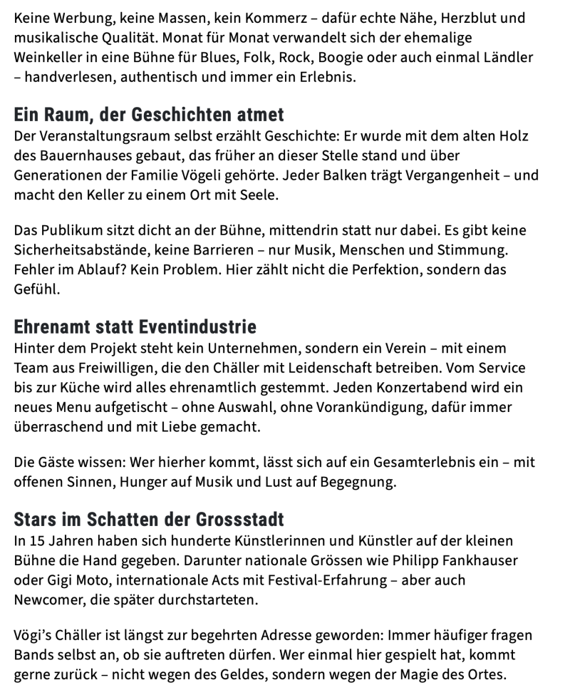 Das kleine feine Konzert- und Eventlokal im Herzen von Rümlang für den besonderen Konzertabend mit einem feinen Znacht. Das spezielle Ambiente und die familiäre Gastfreundschaft werden von Künstlerinnen, Künstler und Gästen sehr geschätzt.